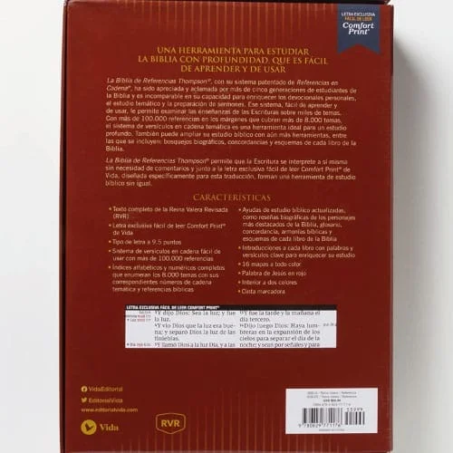 Con un sistema de referencia patentado, apreciado y aclamado por más de cinco generaciones, las Biblias de Referencia Thompson RVR no tienen comparación en su capacidad para enriquecer los devocionales personales, el estudio de temas y la preparación de sermones. Este sistema, fácil de aprender y de usar, le permite ver la amplitud de las enseñanzas de las Escrituras sobre miles de temas. Con más de 100.000 referencias listadas en los márgenes de la Biblia, que cubren más de 8.000 temas, el sistema de referencias en cadena es una herramienta ideal para el estudio exhaustivo de temas. También puede ampliar su estudio bíblico con más herramientas, incluyendo bosquejos biográficos, y esquemas de cada libro de la Biblia. La Biblia de Referencias en Cadena Thompson permite que las Escrituras se interpreten a sí mismas sin necesidad de comentarios.